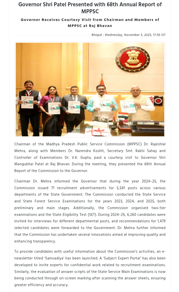 मप्र लोक आयोग (एमपी पीएससी) ने वर्ष 2024- 25 में विभिन्न शासकीय विभागों के 5 हजार 581 पदों के लिए 71 विज्ञापन (अधिसूचना जारी किए। आयोग ने इस अवधि में कुल 6 हजार 260 अभ्यर्थियों को इंटरव्यू के लिए बुलाया। साथ ही 1 हजार 479 पदों पर अभ्यर्थियों का चयन कर शासन को अनुशंसा भेजी गई। इसको लेकर राज्यपाल मंगूभाई पटेल को वर्ष 2024-25 का वार्षिक प्रतिवेदन सौंपा गया। इसमें पीएससी ने अपनी कई उपलब्धियों का जिक्र किया है।