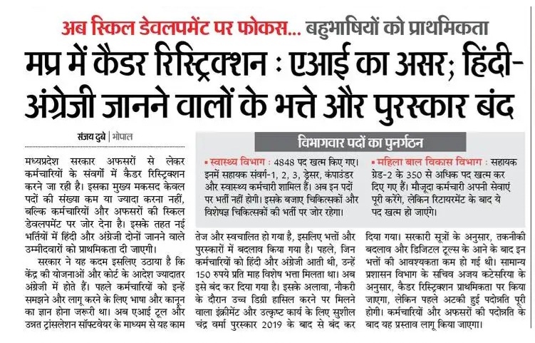 मध्यप्रदेश सरकार अफसरों से लेकर कर्मचारियों के संवर्गों में कैडर रिस्ट्रक्शन करने जा रही है। इसका मुख्य मकसद केवल पदों की संख्या कम या ज्यादा करना नहीं,बल्कि कर्मचारियों और अफसरों की स्किल डेवलपमेंट पर जोर देना है। इसके तहत नई भर्तियों में हिंदी और अंग्रेजी दोनों जानने वाले उम्मीदवारों को प्राथमिकता दी जाएगी।