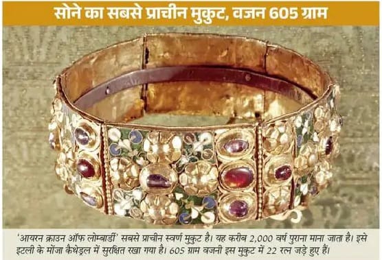 सोने का सबसे प्राचीन मुकुट, वजन 605 ग्राम ‘आयरन क्राउन ऑफ लोम्बार्डी’ सबसे प्राचीन स्वर्ण मुकुट है। यह करीब 2,000 वर्ष पुराना माना जाता है। इसे इटली के मोंजा कैथेड्रल में सुरक्षित रखा गया है। 605 ग्राम वजनी इस मुकुट में 22 रत्न जड़े हुए हैं।