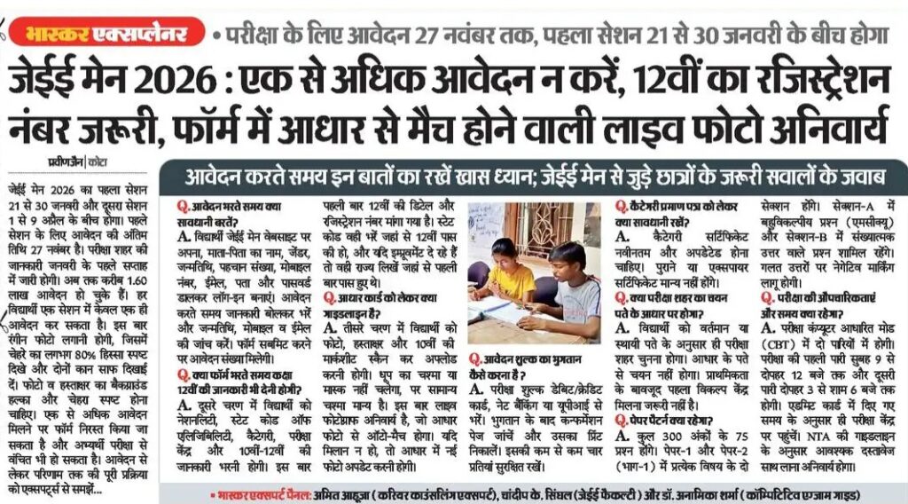 जेईई मेन 2026 : एक से अधिक आवेदन न करें, 12वीं का रजिस्ट्रेशन नंबर जरूरी, फॉर्म में आधार से मैच होने वाली लाइव फोटो अनिवार्य