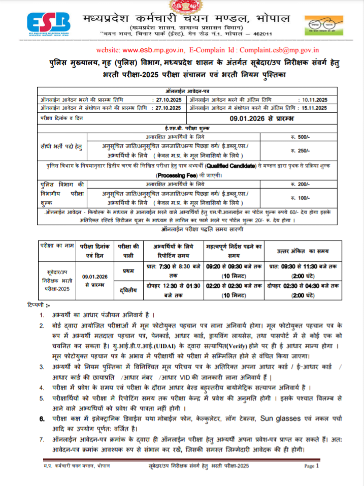 मध्यप्रदेश कर्मचारी चयन मंडल (ESB) : पुलिस विभाग-सूबेदार और उपनिरीक्षक पदों पर भर्ती