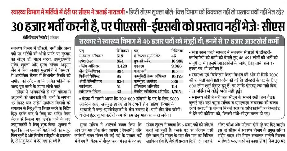 भोपाल । स्वास्थ्य विभाग में डॉक्टरों, नर्सों और अन्य पदों पर भर्तियों की धीमी प्रगति पर गुरुवार को सीएम डॉ. मोहन यादव, उपमुख्यमंत्री राजेंद्र शुक्ला और मुख्य सचिव अनुराग जैन ने चिंता जताई। मुख्यमंत्री ने ‘समत्व’ में आयोजित बैठक में विभागीय स्थिति की समीक्षा की और कहा कि लंबित भर्तियों को जल्द पूरा करने के उपाय खोजे जाएं। सीएम ने अधिकारियों से भर्ती प्रक्रिया में अड़चनों की जानकारी ली। चर्चा के लगभग 15 मिनट बाद उन्होंने संबंधित विभागों को समाधान के बिंदुओं पर विचार करने के निर्देश दिए। इसके बाद वे रिव्यू का आदेश देकर बैठक से निकल गए। उनके जाने के बाद उपमुख्यमंत्री ने रिव्यू शुरू किया। शुक्ला ने पूछा कि जब एक वर्ष पहले पदों की मंजूरी मिल चुकी है और वित्तीय स्वीकृति भी उपलब्ध है, तो नियुक्तियों में देरी क्यों हो रही है। मुख्य सचिव ने आश्चर्य व्यक्त किया कि अब तक मप्र लोक सेवा आयोग (पीएससी) और कर्मचारी चयन मंडल को कई पदों के प्रस्ताव नहीं भेजे गए हैं। सरकार ने स्वास्थ्य विभाग में 46 हजार पदों को मंजूरी दी, इनमें से 17 हजार आउटसोर्स कर्मी पद भी शामिल हैं ।