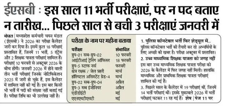 MP ESB : 2026 में 11 भर्ती परीक्षाएं|MPPSC : 2026 कैलेंडर जारी • हाई कोर्ट में मामला लंबित