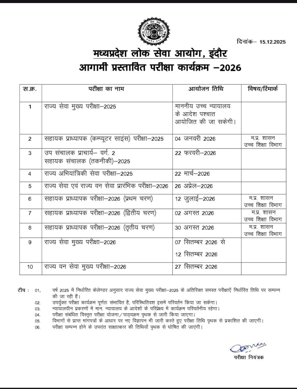 मध्यप्रदेश लोक सेवा आयोग (एम- पीएससी) ने 2026 का परीक्षा कैलेंडर जारीNकर दिया है। राज्य व वन सेवा प्रारंभिक परीक्षा 26 अप्रैल और स्टेट इंजीनियरिंग सर्विस परीक्षा 22 मार्च 2026 को होगी। असिस्टेंट प्रोफेसर भर्ती तीन चरणों में 12 जुलाई, 2 अगस्त और 30 अगस्त को प्रस्तावित है। परीक्षाओं की शुरुआत 4 जनवरी 2026 से होगी। हालांकि राज्य सेवा मुख्य परीक्षा-2025 का उल्लेख तो किया है, लेकिन तारीख नहीं दी है। आयोग के