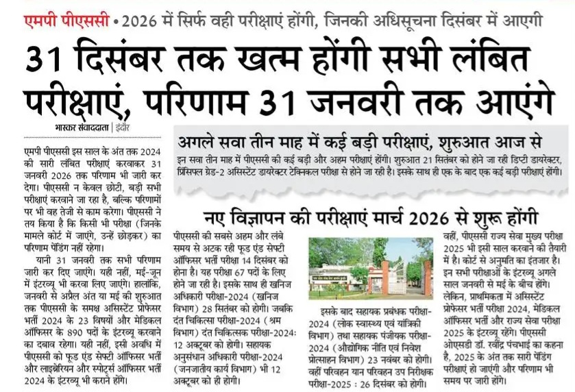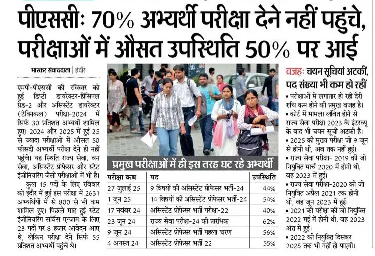 एमपी-पीएससी की रविवार कोडिप्टी डायरेक्टर-प्रिसिपलযर-) और असिस्टेंट डायरेक्टर(टेक्निकल) परीक्षा-2024 सिर्फ 30 प्रतिशत अभ्यर्थी शामिल हुए। 2024 और 2025 में हुई 25 से ज्यादा परीक्षाओं में औसत 50 फीसदी अभ्यर्थी परीक्षा देने ही नहीं पहुंचे। यह स्थिति राज्य सेवा, वनसेवा, असिस्टेंट प्रोफेसर और स्टेट इंजीनियरिंग जैसी परीक्षाओं में भी है। कुल 15 पदों के लिए रविवार को इंदौर में हुई इस परीक्षा में 2631अभ्यर्थियों में से 800 से भी कम शामिल हाए। पिछले माह हुई स्टेट इंजीनियरिंग सर्विस एग्जाम के लिए 23 पदों पर ৪ हजार आवदन आए थे, लेकिन परीक्षा देने सिर्फ 55vप्रतिशत अभ्यर्थी पहुंचे थे।