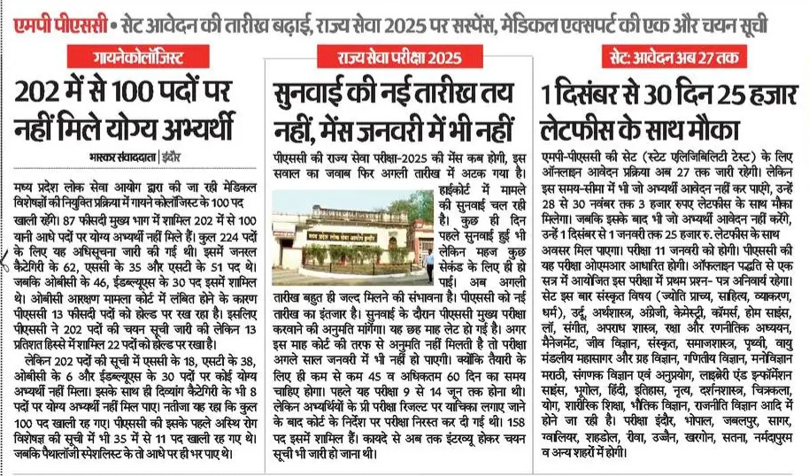 एमपी पीएससी • सेट आवेदन की तारीख अब 27 नवंबर तक बढ़ाई, राज्य सेवा 2025 पर सस्पेंस, मेडिकल एक्सपर्ट की एक और चयन सूची●202 पद में से 100 पदों पर नहीं मिले योग्य अभ्यर्थी