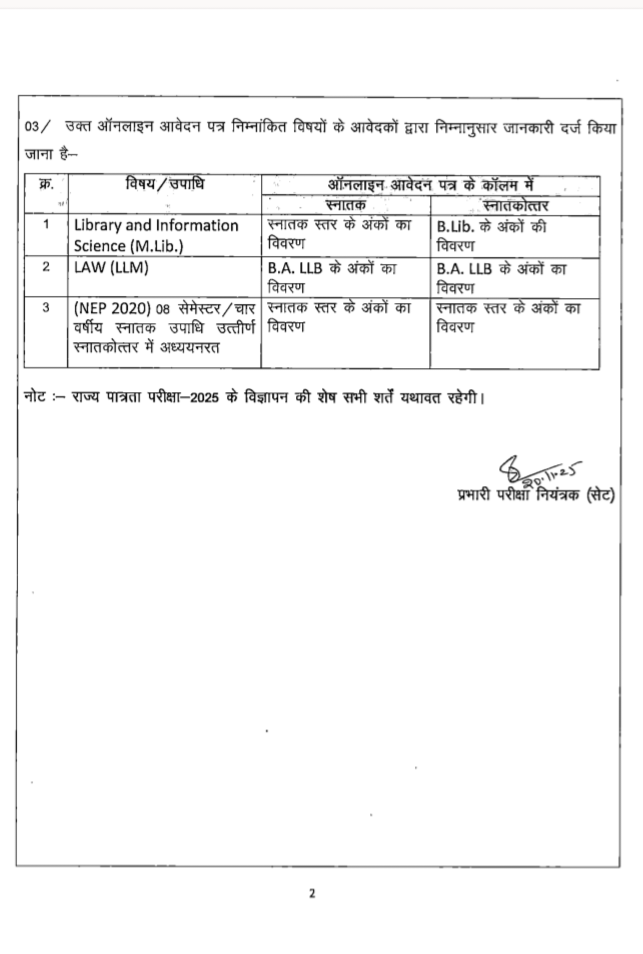 एमपी-पीएससी की सेट (स्टेट एलिजिबिलिटी टेस्ट) के लिए ऑनलाइन आवेदन प्रक्रिया अब 27 नवंबर तक जारी रहेगी। इसे अब 20 नवंबर 2025 किया गया ।लेकिन इस समय-सीमा में भी जो अभ्यर्थी आवेदन नहीं कर पाएगे, उन्हें 28 से 30 नवंबर तक 3 हजार रुपए लेटफिस के साथ मौका मिलेगा। जबकि इसके बाद भी जो अभ्यर्थी आवेदन नहीं करेंगे, उन्हें 1 दिसंबर से 1 जनवरी तक 25 हजार रु. लेटफिस के साथ अवसर मिल पाएगा। परीक्षा 11 जनवरी को होगी। पीएससी की यह परीक्षा ओएमआर आधारित होगी। ऑफलाइन पद्धति से एक सत्र में आयोजित इस परीक्षा में प्रथम प्रश्न- पत्र अनिवार्य रहेगा। सेट इस बार संस्कृत विषय (ज्योति प्राच्य, साहित्य, व्याकरण, धर्म), उर्दू, अर्थशास्त्र, अंग्रेजी, केमेस्ट्री, कॉमर्स, होम साइंस, लॉ, संगीत, अपराध शास्त्र, रक्षा और रणनीतिक अध्ययन, मैनेजमेंट, जीव विज्ञान, संस्कृत, समाजशास्त्र, पृथ्वी, वायु मंडलीय महासागर और ग्रह विज्ञान, गणितीय विज्ञान, मनोविज्ञान, मराठी, संगणक विज्ञान एवं अनुप्रयोग, लाइब्रेरी एंड इन्फॉर्मेशन साइंस, भ्रातिल, हिंदी, इतिहास, नृत्य, दर्शनशास्त्र, चित्रकला, योग, शारीरिक शिक्षा, भौतिक विज्ञान, राजनीति विज्ञान आदि में होने जा रही है। परीक्षा इंदौर, भोपाल, जबलपुर, सागर, ग्वालियर, शहडोल, रीवा, उज्जैन, खरगोन, सतना, नर्मदापुरम व अन्य शहरों में होगी।