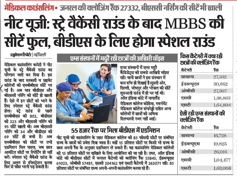 स्ट्रे वैकंसी राउंड का परिणाम जारी : बीडीएस और बीएबीएसी नर्सिंग की सीटें ही खाली
